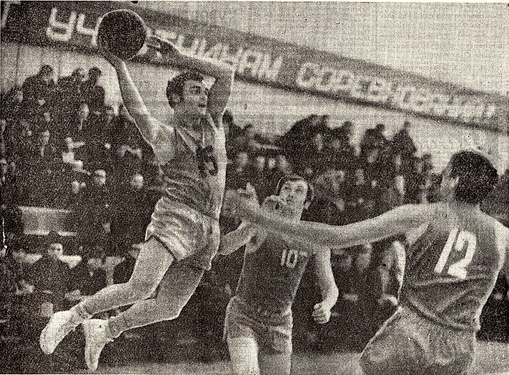 Москва. Матч XXXIX чемпионата СССР ЦСКА – СКА (Киев). Разыгрывающий киевлян Зураб Хромаев (будущий тренер сборной СССР), которого опекают Сергей Белов и Алжан Жармухамедов (№ 12), вместе с партнерами сотворил главную сенсацию чемпионата, взлетев на третье место