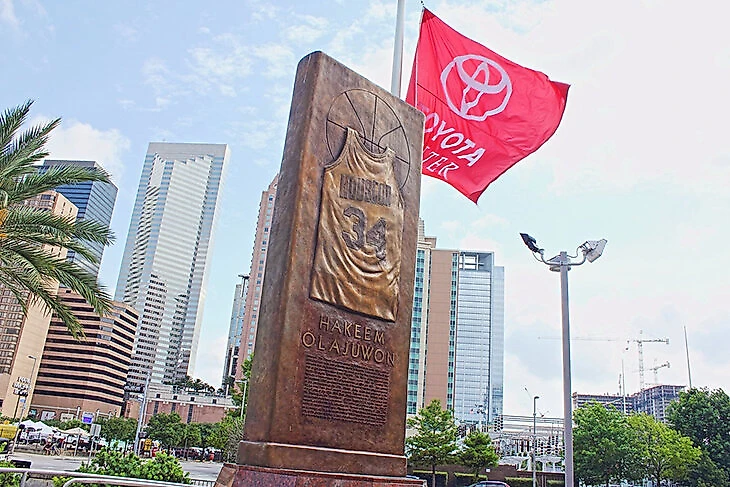 Как по мне, самый оригинальный памятник воздвигли «Хьюстон Рокетс», решившие, что пластику движений Хакима Оладжувона невозможно сымитировать. Зато его монументальность отлично выразит плита с изображением майки центрового и перечислением его регалий.