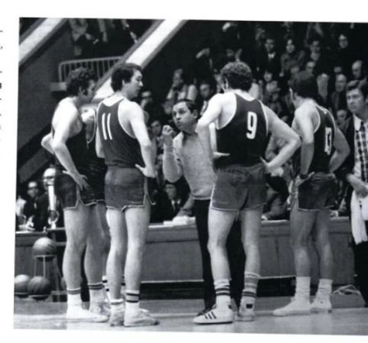 12 мая. Москва. Дворец спорта. СССР — США — 77:83. Тайм-аут Владимира Кондрашина, рядом — Александр Белов, Евгений Коваленко (№ 11), Иван Едешко (№ 9), Алексей Таммисте