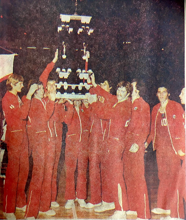 28 февраля 1974. Ленинград. Дворец спорта «Юбилейный». Матч XLI чемпионата СССР «Спартак» — ЦСКА — 70:72. Слева направо: Виктор Петраков, Алжан Жармухамедов, Александр Белов, Владимир Арзамасков. После этой победы уже никто не мог остановить ЦСКА на пути к очередному чемпионству