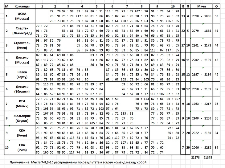 ЦСКА — 21–1, «Спартак» — 18–4, «Строитель» — 13–9, «Динамо» М — 12–10, «Калев» — 11–11, «Динамо» Тб, «Жальгирис» — 9–13, РТИ, СКА Р — 6–16, СКА К — 5–17.