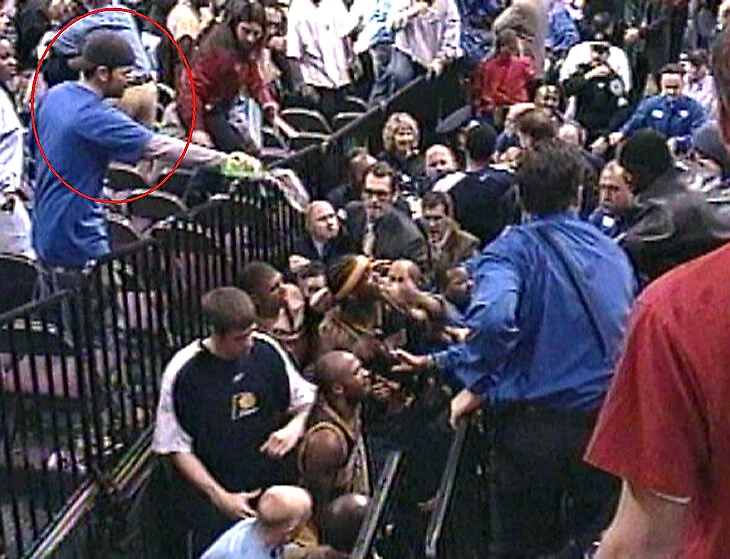 Именно в этот момент в игрока «Пэйсерс» полетело пиво со стороны болельщика «Пистонс» Джона Грина.