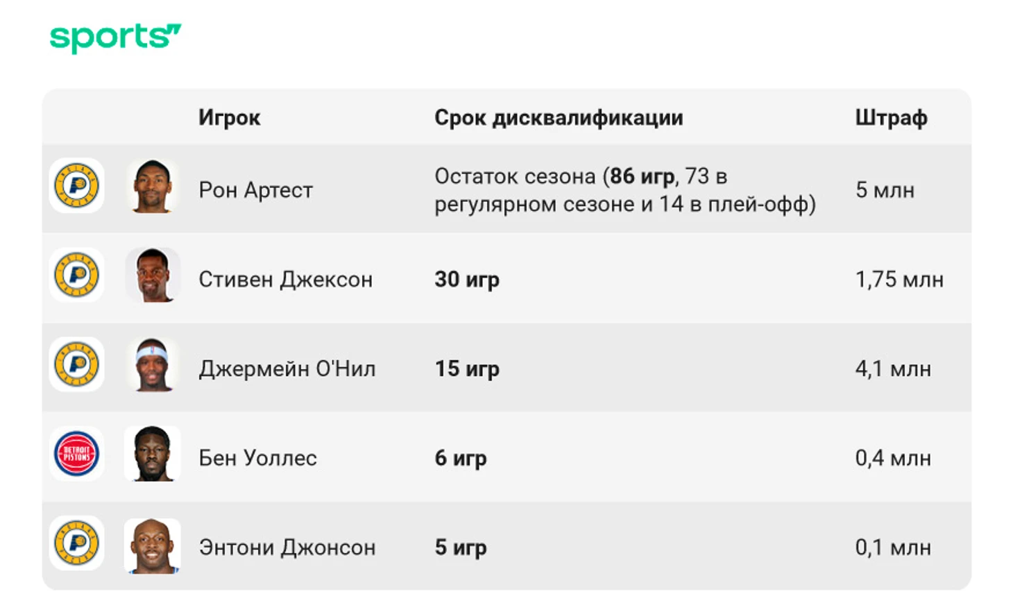 Федеральный арбитратор оставил в силе почти все наказания – только сократил срок дисквалификации О’Нилу с 25 до 15 матчей. НБА подала апелляцию на это решение, но суд в Нью-Йорке оставил новый срок Джермейну в силе.