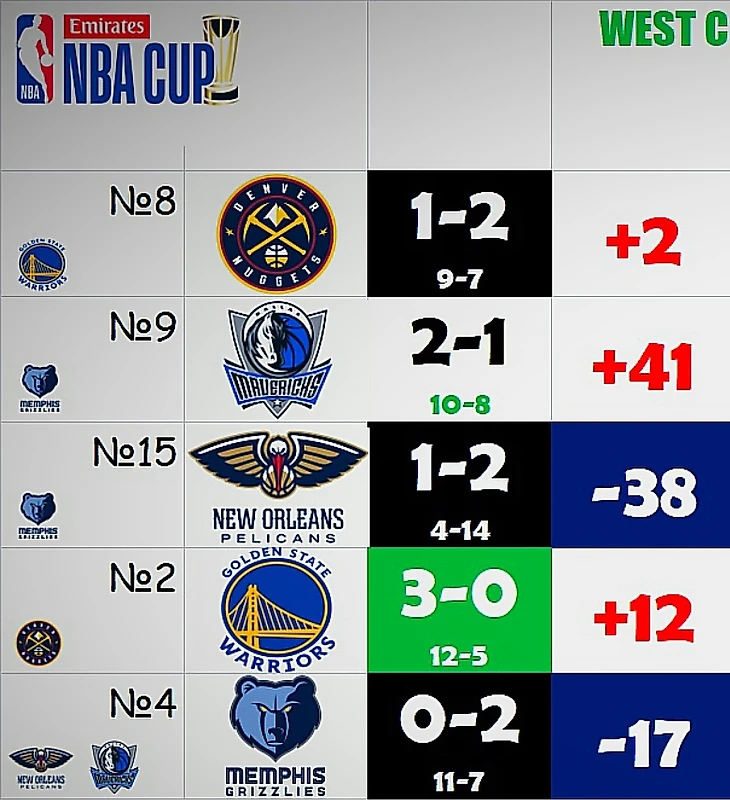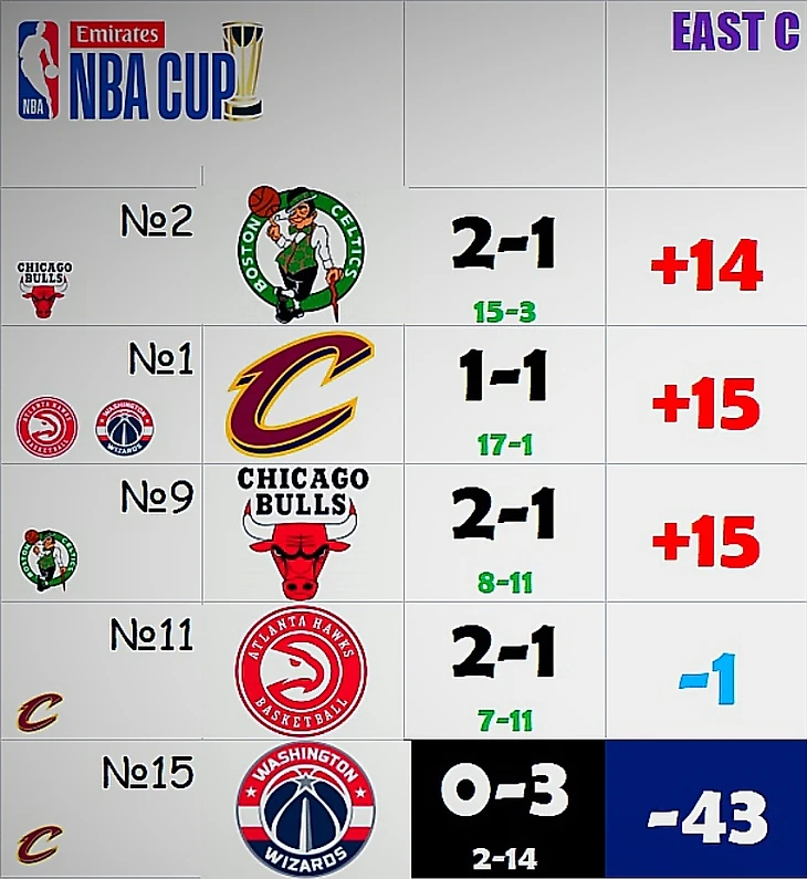 Под номерами (к примеру: №4 у Никс – место на востоке) добавим логотипы соперников, с которыми еще предстоят встречи в рамках группового этапа Кубка в том порядке, в котором они и пройдут хронологически: для Нью-Йорка в нашу субботу Хорнетс, а в среду (4 декабря) – завершающий матч с главным конкурентом за первое место в группе «Ист-А».