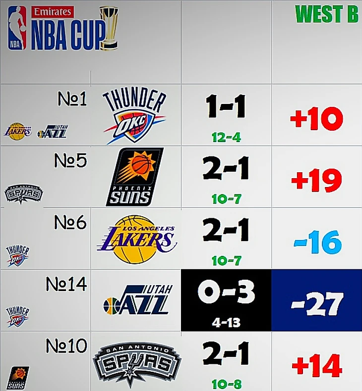 Для сравнения выложу официальную инфографику Кубка эмиратов. Отличия только в разнице «забитых-пропущенных». Лига дельту в счете, полученную в овертаймах Кубка, не считает. То есть все матчи с овертаймами на их инфографике идут в актив таким командам с дельтой «ноль»: и проигравшим в итоге, и победителям. Поэтому у Майами нет «-2» от Детройта, у Сакраменто нет «-4» от Миннесоты, а у Хьюстона нет «+6» после победы над Волками.
