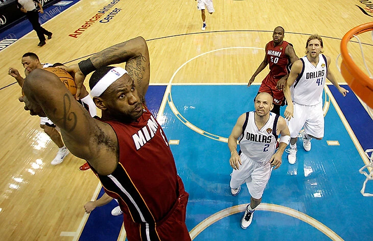 В ту эпоху Джеймс был на пике физической формы, предпочитал нагло лезть в трехсекундную, прыгать через людей, ставить сверху. Не сказать, что тянул все на себе, ведь с ним бок о бок бились Дуэйн Уэйд, Крис Бош, Рэй Аллен на закате. Но все же возможностей набирать очки самому было чересчур много.