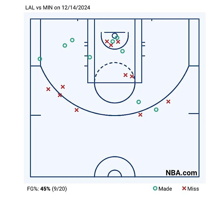 С 21-й потери «Лейкерс» привезли себе 27 очков. Гости ни разу не вышли вперед. Как только получалось сократить счет (например трешками Ривза и Винсента в третьей четверти), сразу мяч терялся и трансформировался в очки «волков».