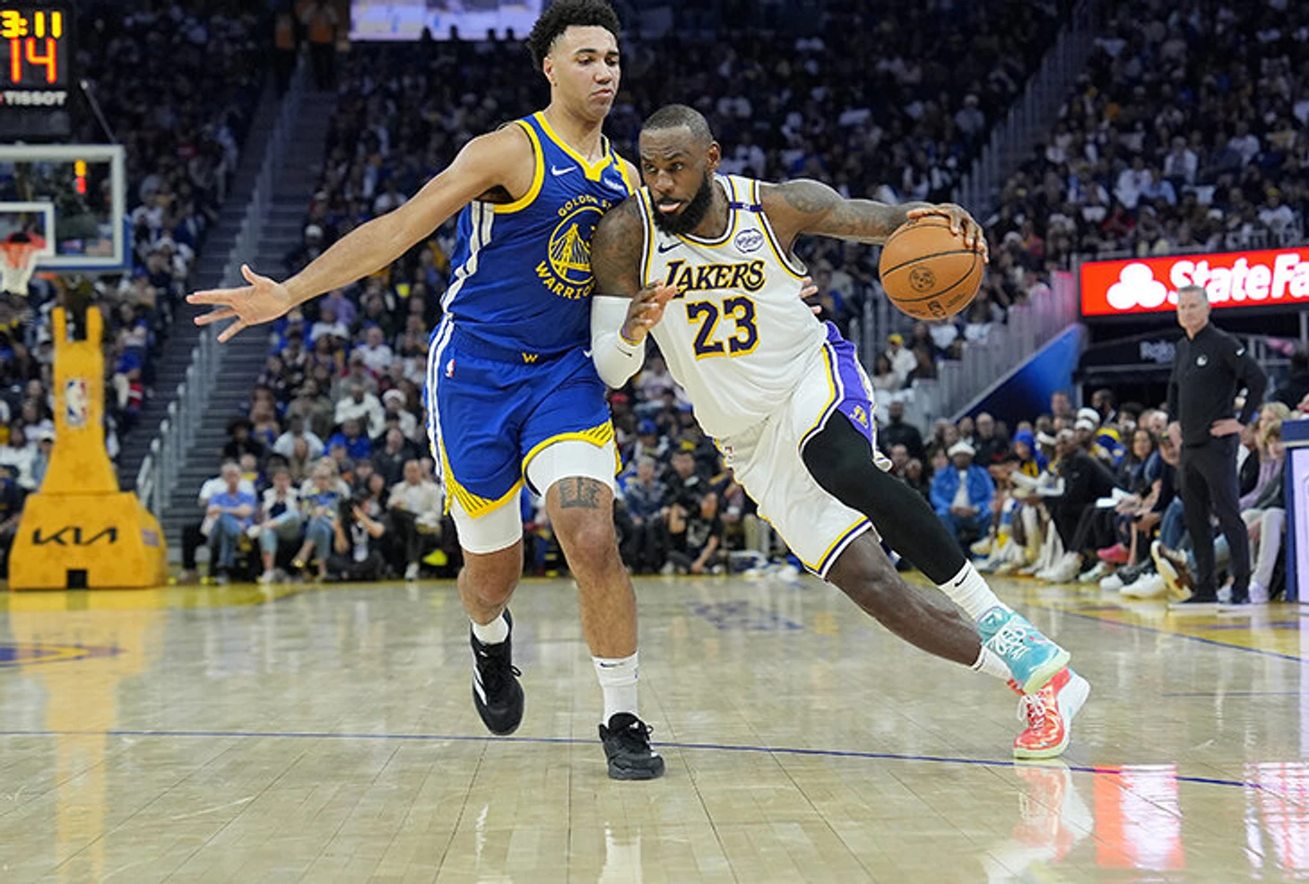 «Лос-Анджелес» пытался сбить темп, тянул время, но каждый раз «Голден Стэйт» брал длинный подбор и атаковал в быстром ритме. Остин Ривз потянул время и после заслона от Леброна решил бросить издали, не скидывая четырехкратному чемпиону, хотя возможность была.