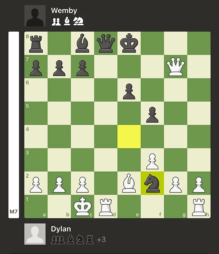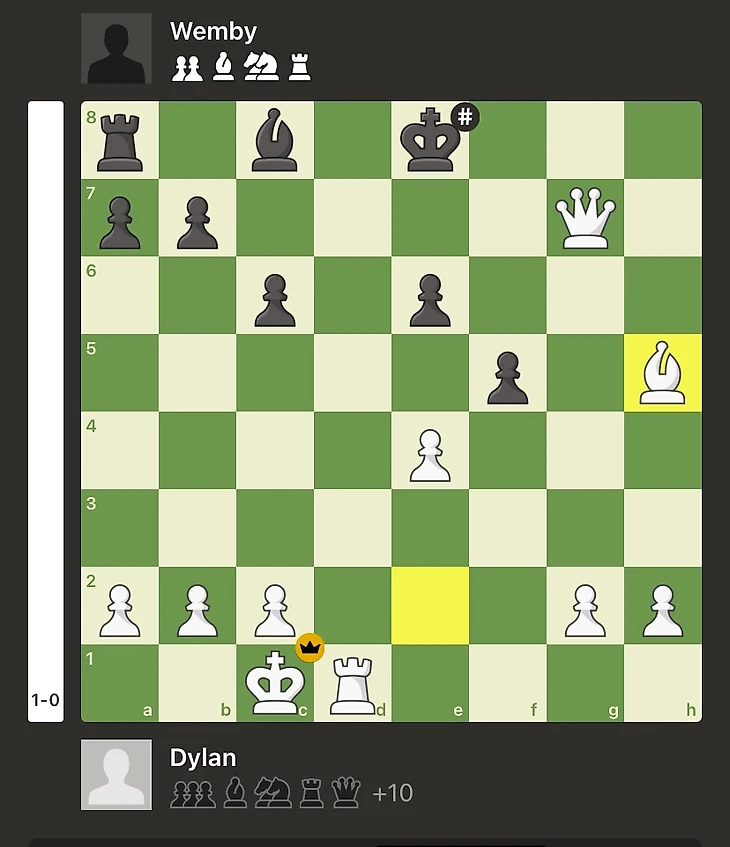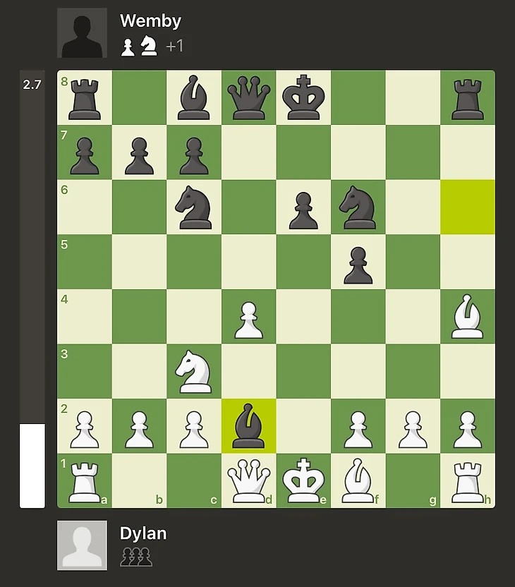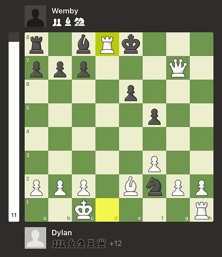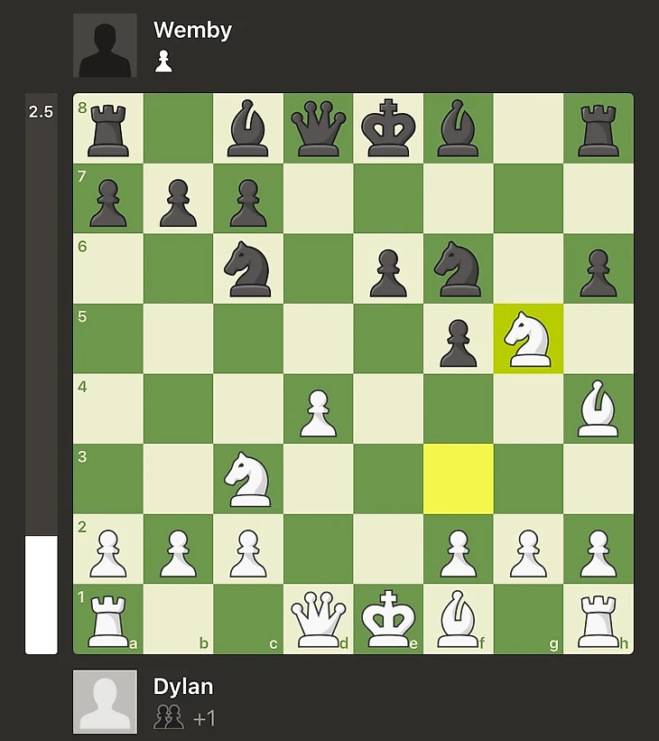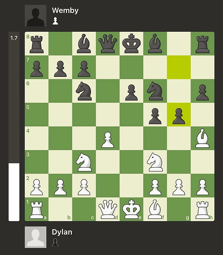 Он прикрепил ссылку на полный матч. Вембаньяма, играя за черных, развивал левый фланг, загнал вражеского слона пешкой. Дилан пожертвовал конем.