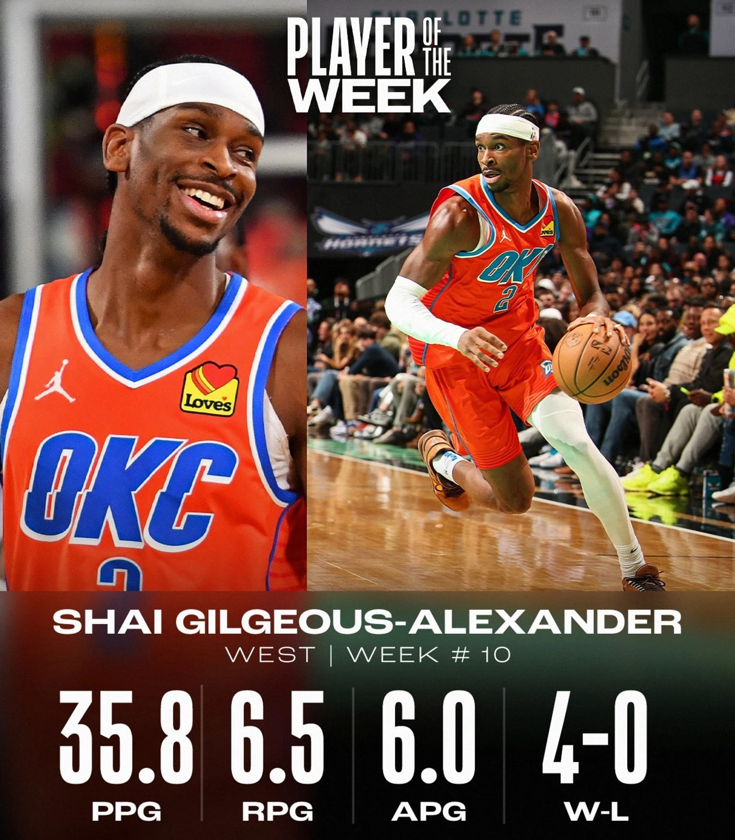 Хороший игрок на пике формы. В топ-3 лучших последние два года. Умеет исправлять свои слабые стороны и прибавлять по ходу сезона, в отличии от Тэйтума. Сейчас впервые Шэй (30,2) преодолел критическую в классификации Холлинджера точку PER=30,0 и зашел на этаж Яниса и Йокича. Команда Гилджеса идет на сухой серии 12-0 после поражения Хьюстону 1 декабря, восточным еще ни разу не проигрывала (9-0, хотя самых монстров с ист-сайд еще не встречали). Ведет себя скромно, одевается стильно... Похоже получит канадец еще одну награду на западе: будет у ШГА «Игрок декабря».