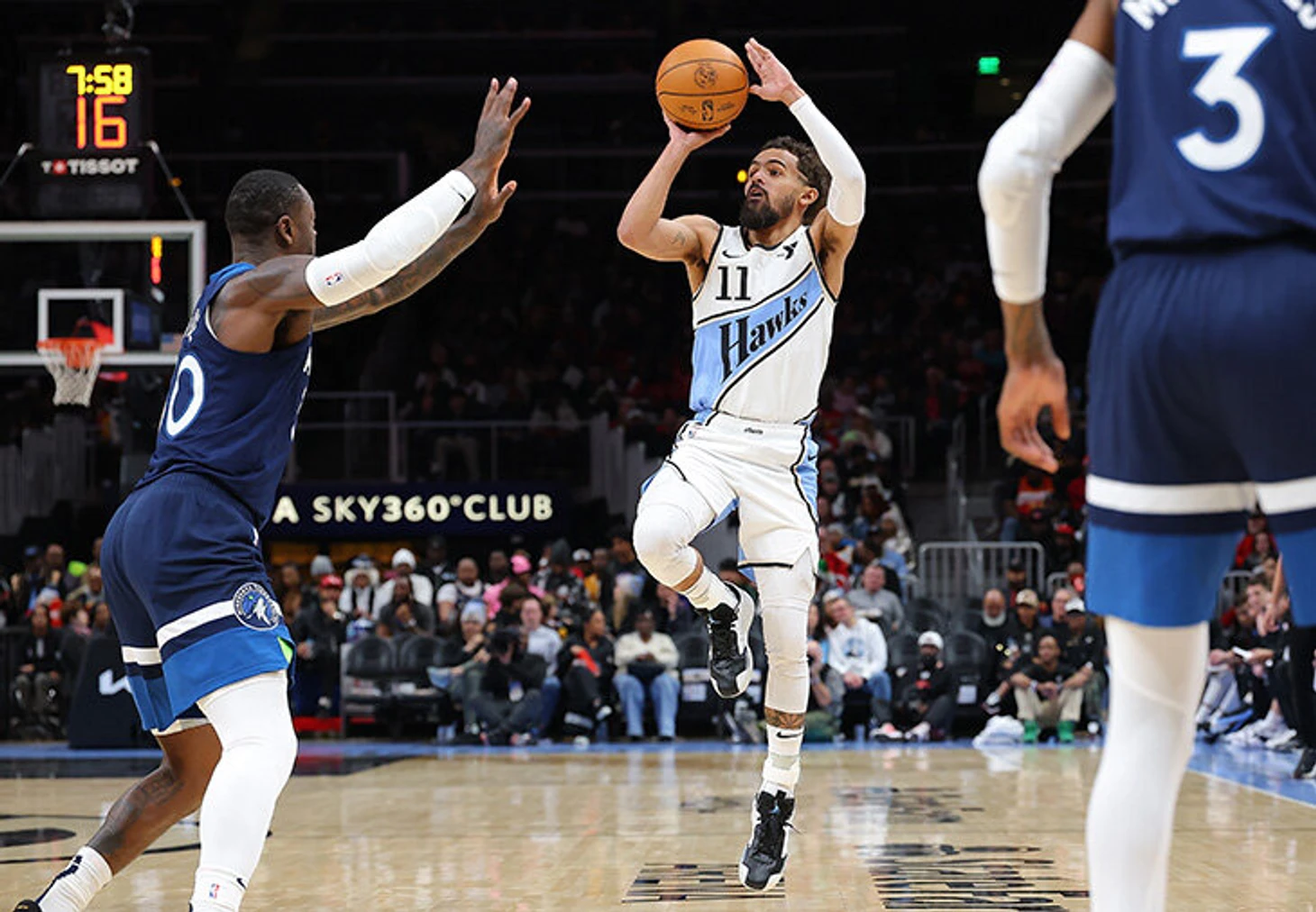Так что мы уже видели новые подходы к пространству при трехочковом или к быстроте релиза мяча, а теперь – и к динамике броска. Трехочковые с одной ноги будут попадаться нам все чаще. Трей Янг уже придумал, как сделать такой прием полноценным оружием, а не просто разовым баловством – разыгрывающий «Атланты» получает заслон далеко от кольца и переходит на шаги в районе трехочковой, после чего может выбрать, атаковать ли кольцо самому или отдать передачу. Остановка замедляет процесс, а движение вперед, наоборот, дополнительно напрягает защитников. Отдать классную передачу в полете для Трэя не составляет труда, а в прыжке низкорослый Янг оценивает ситуацию с другого ракурса.