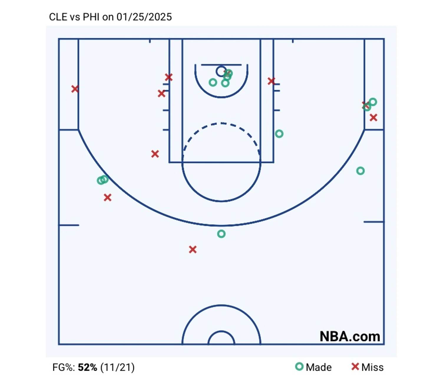Бесконечные пуляния из-за дуги скучно смотреть, если бросает абы кто. Но когда это эффективно, почему нет? Сегодня все залетало и у одних, и у других: 25 из 52 (48,1%) у «Кливленда» и 21 из 39 (53,8%) у «Филадельфии».