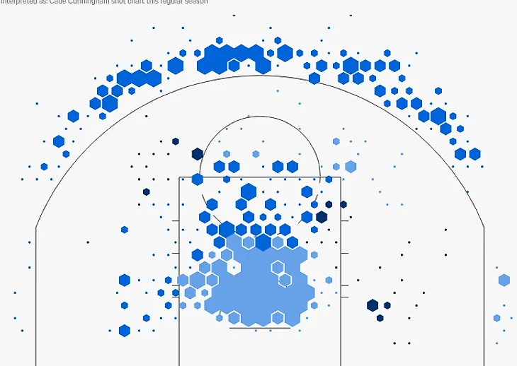 У Каннингема в принципе очень сбалансированный график бросков. После проблем на старте карьеры все хорошо с трехочковыми (36% реализации при 6,3 попытках за матч), есть ощутимая доля средних бросков, а также различные варианты завершения вблизи кольца.