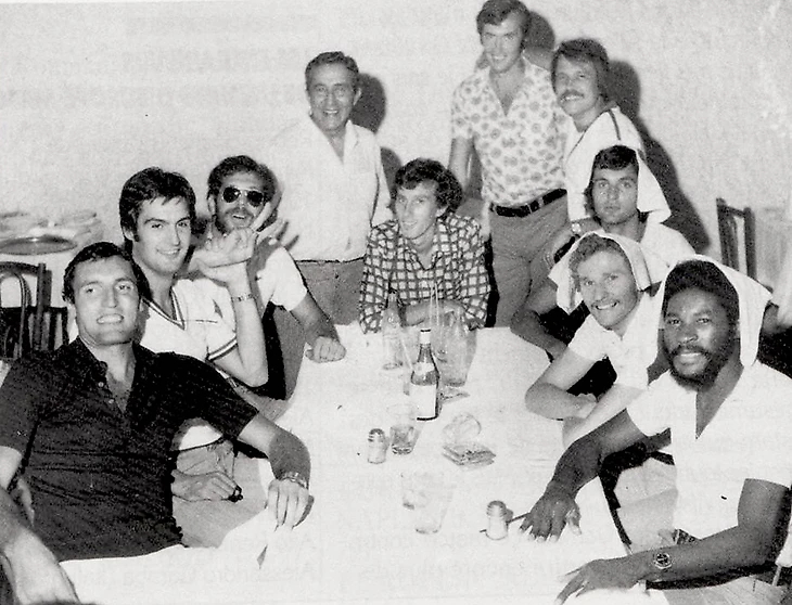 4 октября 1974. Рим. Прощальный ужин игроков сборной Европы (по часовой стрелке): Дино Менегин, Луис Мигель Сантильяна, Василис Гумас, тренер Джанкарло Примо, Пьерлуиджи Марзорати, Сергей Белов, помощник тренера, Дамир Шолман, Уэйн Брабендер, Жак Кашемир