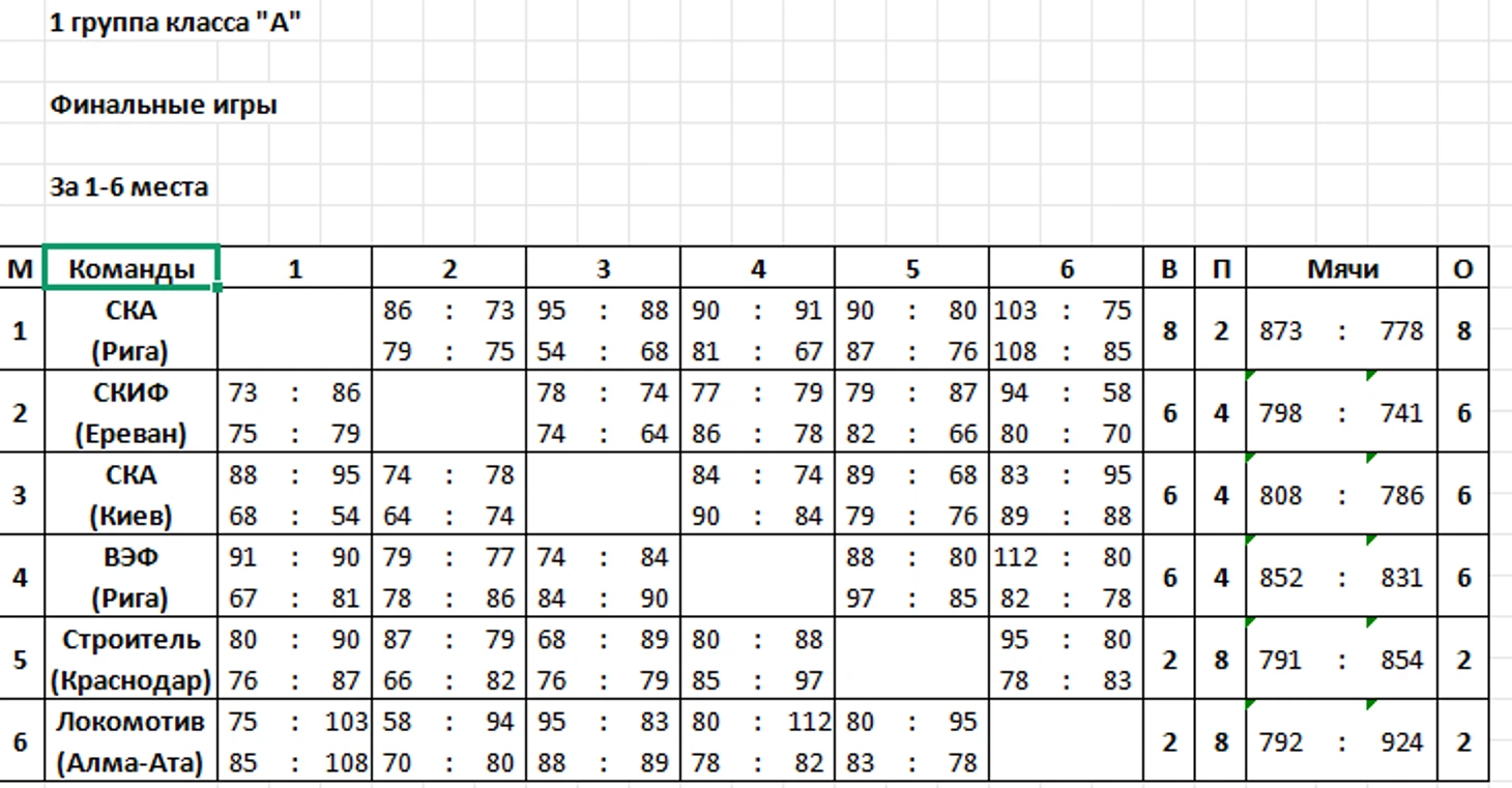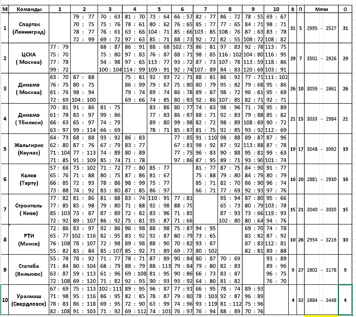 «Спартак», «Динамо» М, «Динамо» Тб — 7–1, ЦСКА — 6–2, «Жальгирис» — 5–3, «Калев» — 3–5, «Строитель» — 2–4, «Статиба» — 2–6, РТИ — 1–7, «Уралмаш» — 0–10.