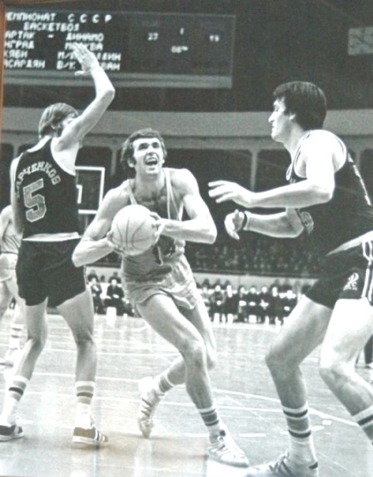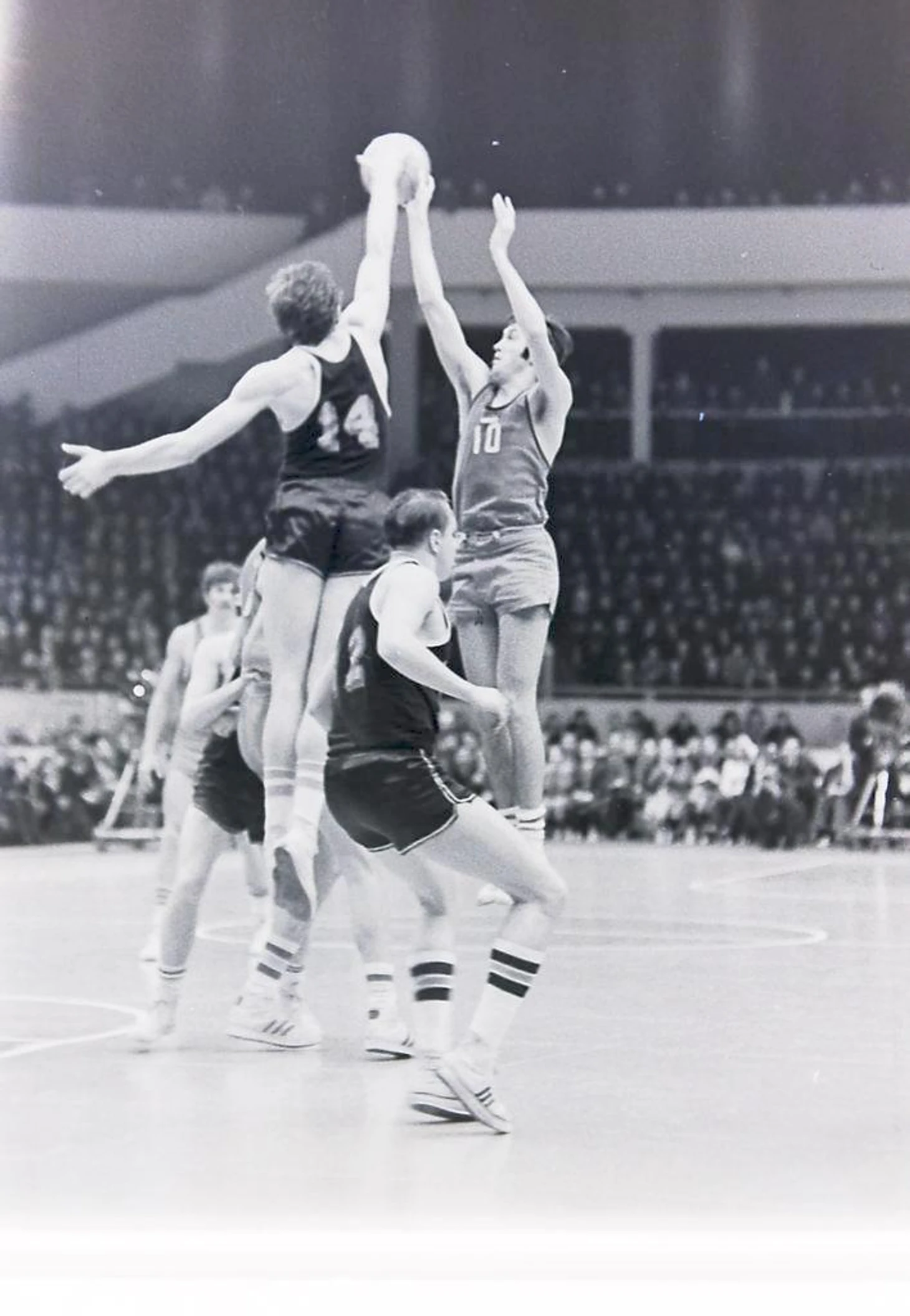 21 ноября 1974. Ленинград. ДС «Юбилейный». «Спартак» выигрывает у московского «Динамо» — 76:61. Александр Белов (с мячом) против Александра Харченкова (№ 5) и Александра Болошева. Через день победят уже динамовцы — 72:69