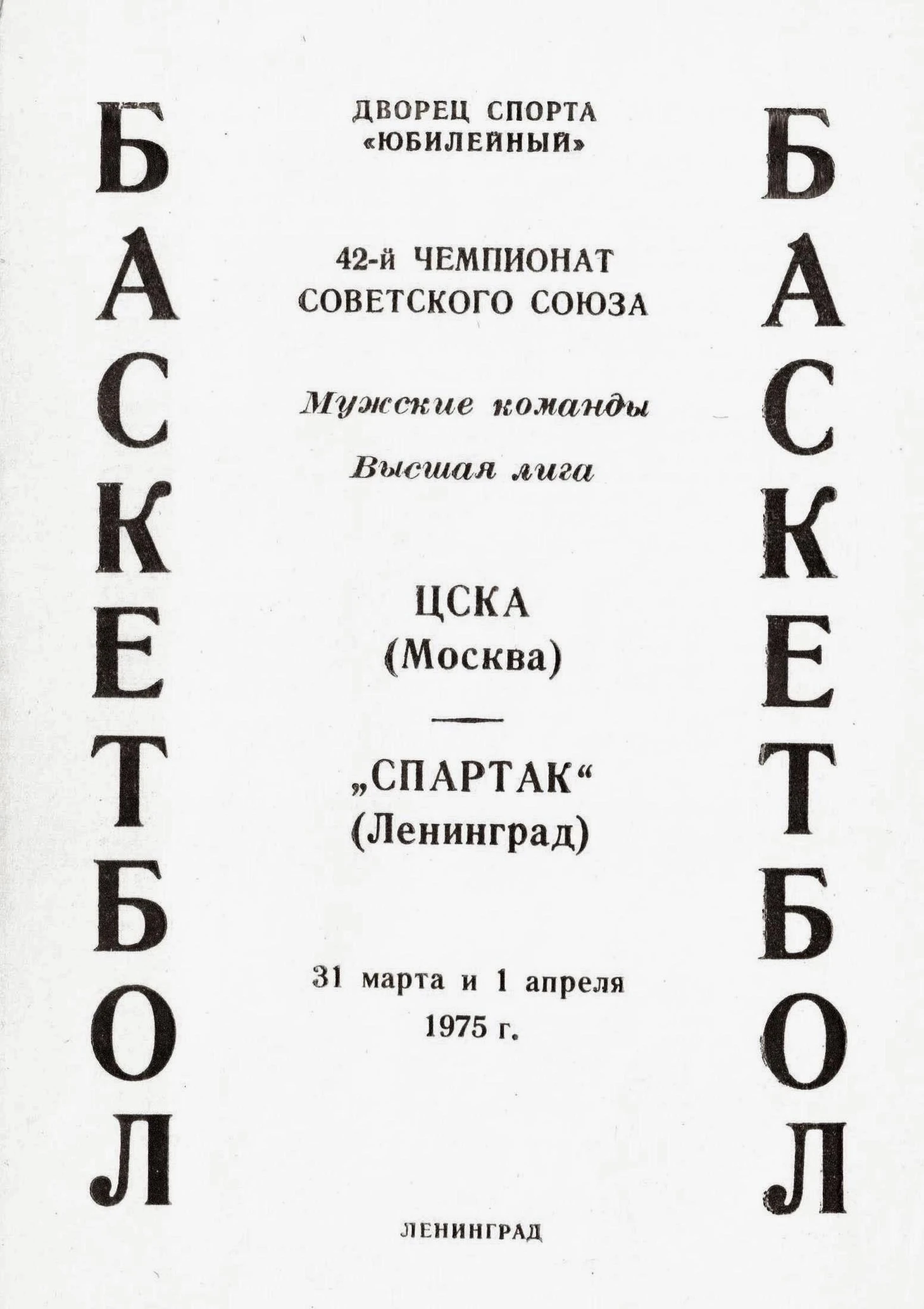 31 марта 1975. Ленинград. ДС «Юбилейный». «Спартак», победив ЦСКА — 78:77, стал чемпионом страны. В воздухе Александр (№14) и Сергей Беловы. На дальнем плане Иван Едешко, на ближнем — Юрий Штукин