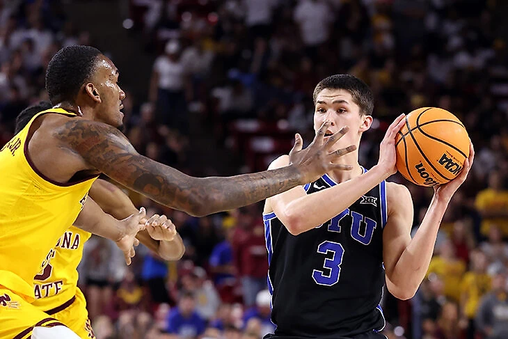 Например, его трехочковые (28%, 4,4 за матч в среднем) явно нельзя воспринимать тупо в лоб. Большинство бросков Демина – это либо трехочковые с ведения после двоек (то есть самые сложные попытки в баскетболе), либо броски под 45 с восьми метров и сопротивлением. У BYU просто нет игроков, которые бы создавали для него комфортные атаки – и при этом 48% от всех бросков Демина это трехочковые. Наверное, если бы была доступна более детальная статистика, она бы дала больше информации: например, на Bart Torvik пишут о том, что 32% его трехочковых – это атаки с ведения.