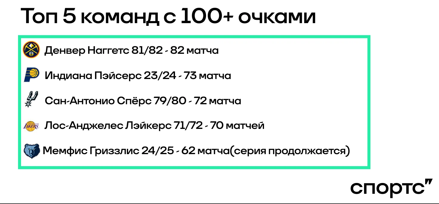 Мемфис Гриззлис забили 103 очка в последнем матче с Оклахомой, эта встреча стала 62 подряд в которой Гриззлис пробили 100+ очков, тем самым они стали 5 командой в истории с данным достижением: