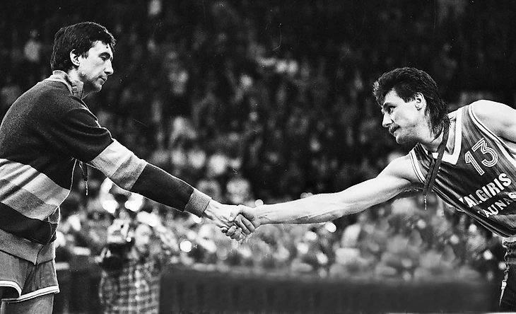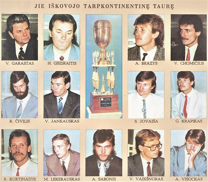 14 сентября 1986. Буэнос-Айрес. Эстадио Обрас Санитариас. «Жальгирис» — победитель XX розыгрыша Межконтинентального кубка (слева направо): стоят — Гинтарас Крапикас, Виргиниюс Янкаускас, Арвидас Сабонис, Раймондас Чивилис, Миндаугас Лекараускас, главный тренер Владас Гарастас, Арунас Висоцкас; сидят — Сергеюс Йовайша, Римас Куртинайтис, Вальдемарас Хомичус, Альгирдас Бразис