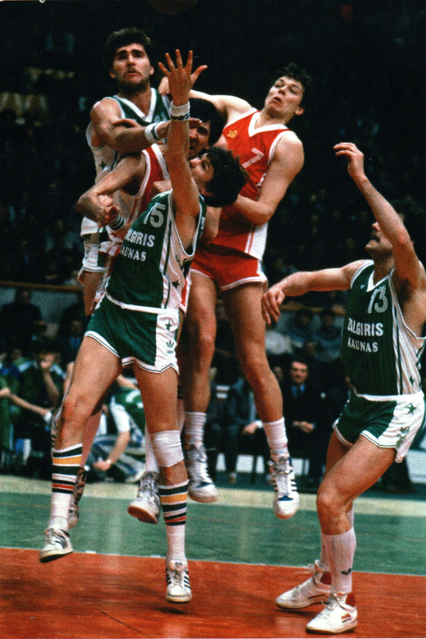 14 июня 1987. Афины. Стадион мира и дружбы. Финал XXV чемпионата Европы СССР — Греция — 101:103. Шарунас Марчюленис (№ 12) пытается сдержать Никоса Галиса (№ 4). Аргирис Камбурис (№ 7) и Фанис Христодулу вместе с Валерием Тихоненко следят за единоборством