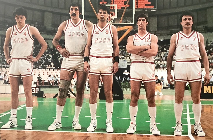 3 июня 1987. Афины. Стартовая пятерка сборной СССР перед матчем с Югославией (слева направо): Александр Волков, Владимир Ткаченко, Валерий Тихоненко, Шарунас Марчюленис, Вальдемарас Хомичус