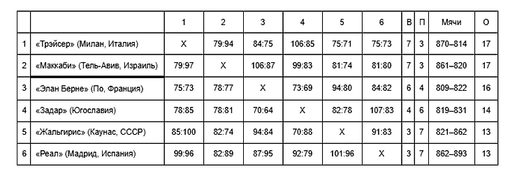 Состав полуфинальной группы выглядел впечатляюще: чемпионы Испании, Югославии, Франции, Израиля, Италии и СССР.