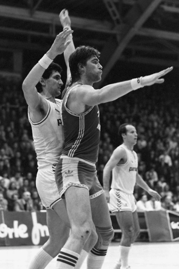 4 декабря 1986. Каунас. «Спортхале». Матч группового турнира Кубка чемпионов «Жальгирис» — «Реал» (Мадрид) — 91:83. Арвидаса Сабониса (30 очков), опекает Фернандо Ромай (14), рядом Хуан Антонио Корбалан (2)