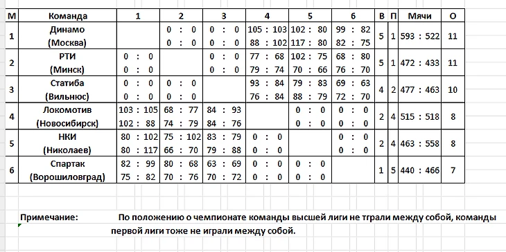 В ПЕРЕХОДНОМ ТУРНИРЕ LIV ЧЕМПИОНАТА СССР (три команды высшей лиги дважды встретились с тремя оппонентами из первой) баскетболисты РТИ, московского «Динамо» и «Статибы» сохранили свои места в высшей лиге. Трио старожилов не позволило подняться наверх новосибирскому «Локомотиву», ворошиловградскому «Спартаку» и НКИ. Ротация между лигами случилась единственная — вместо СКА (Алма-Ата) в элиту поднялся победитель первой лиги таллинский «Калев».