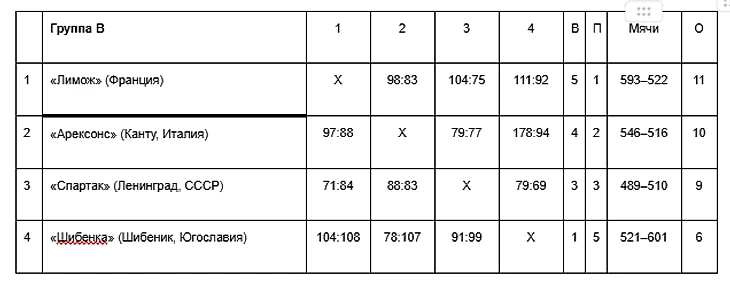Ленинградский «Спартак» выбывает из розыгрыша Кубка Корача на стадии группового этапа. Финал: «Барселона» (Испания) — «Лимож» (Франция) — 106:85 и 97:86.