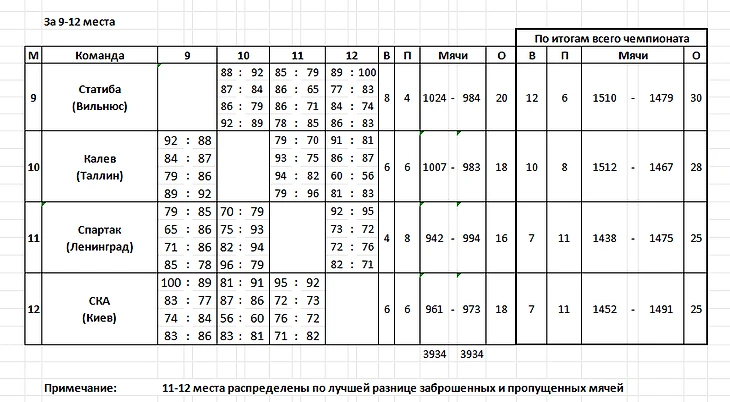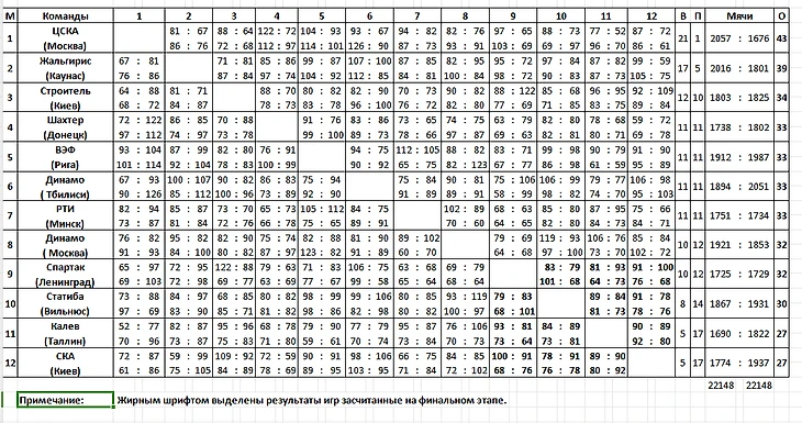 1. ЦСКА — 21–1 (дома — 7–1, на нейтральной площадке — 6–0, в гостях — 8–0). 2. «Жальгирис» — 17–5 (6–1, 7–1, 4–3). 3. «Строитель» — 12–10 (4–4, 5–3, 3–3). 4. «Шахтер» — 11–11 (5–2, 4–4, 2–5). 5. ВЭФ — 11–11 (1–3, 7–5, 3–3). 6. «Динамо» Тб — 11–11 (4–3, 2–6, 5–2). 7. РТИ — 11–11 (4–3, 6–4, 1–4). 8. «Динамо» М — 10–12 (5–3, 2–4, 3–5). 9. «Спартак» — 10–12 (3–4, 4–4, 3–4). 10. «Статиба» — 8–14 (2–2, 4–6, 2–6). 11. «Калев» — 5–17 (2–5, 2–6, 1–6). 12. СКА К — 5–17 (3–5, 1–7, 1–5).