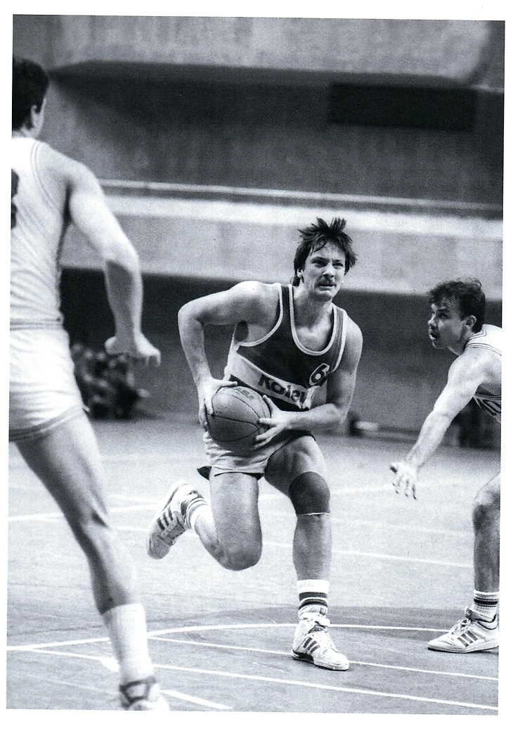 4 октября 1987. Рига. На площадке Центрального дома спорта «Даугава» впервые после дисквалификации появился московский армеец Игорс Миглиниекс (справа). Здесь он во время матча ВЭФ — ЦСКА — 93:104 против бывшего одноклубника Гундарса Ветры, рядом с которым — Виктор Панкрашкин