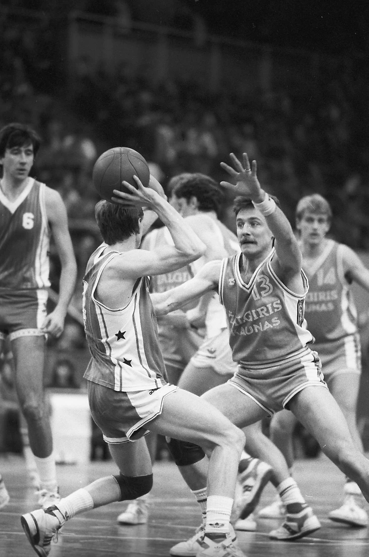 1984 год. Москва. УСЗ ЦСКА. Три звезды, которые сыграли все 16 суперфинальных матчей ЦСКА — «Жальгирис»: Сергеюс Йовайша (№ 15) — средняя результативность 10,8, Вальдемарас Хомичус (№ 13) — 14,4 и Сергей Тараканов — 13,9