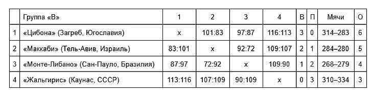 В своей группе «Жальгирис» стал четвертым, уступив по очереди бразильскому «Монте-Либано» — 90:109, израильскому «Маккаби» — 107:109 и югославской «Цибоне» — 113:116 в овертайме.