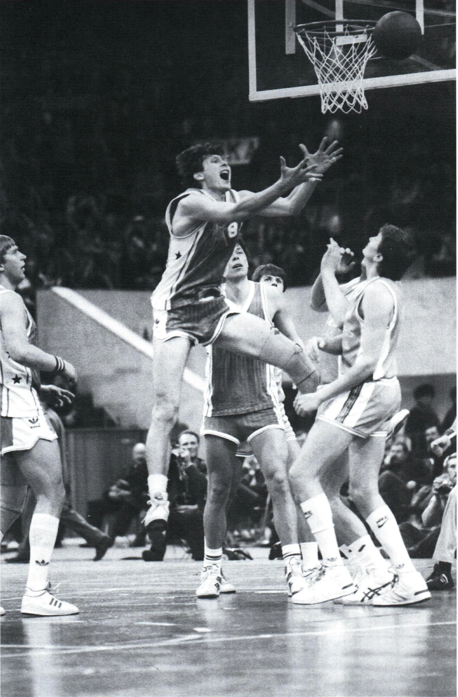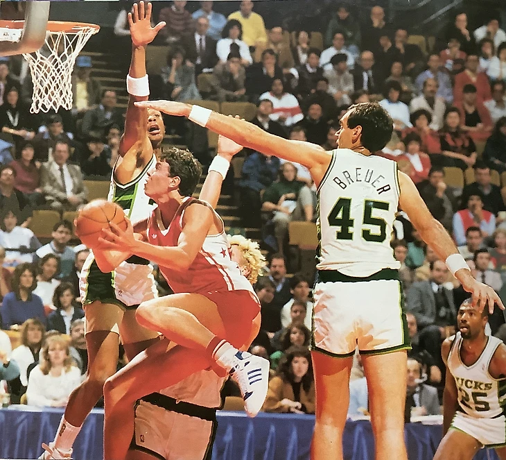 25 октября 1987. Милуоки. Арена Mecca. Эпизод матча «Милуоки Бакс» — сборная СССР — 127:100. Рэнди Брюер (№ 45), Джек Сикма и Терри Каммингс (слева) не успевают блокировать проход Александра Волкова, который сейчас наберет очередные 2 очка (из своих 17 в этом матче)