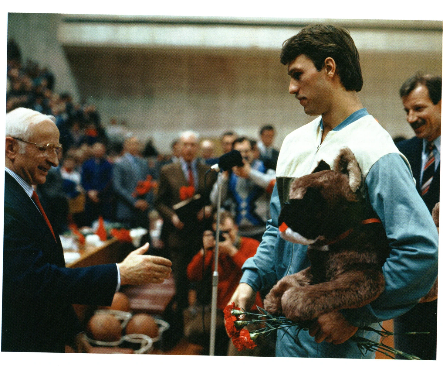 Москва. УСЗ ЦСКА. Лучший игрок сезона 1987–1988 Шарунас Марчюленис получает поздравления от Александра Гомельского