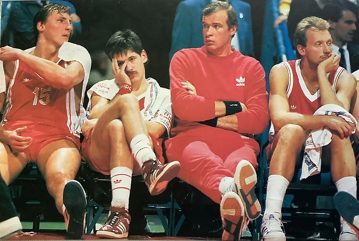 25 октября 1987. Милуоки. Арена Mecca. Эпизод матча «Милуоки Бакс» — сборная СССР — 127:100. Скамейка запасных советской команды (слева направо): Валерий Гоборов, Валдис Валтерс, Александр Белостенный, Римас Куртинайтис. Судя по их выражению лиц, именно в этот момент мы очень много проигрывали американцам