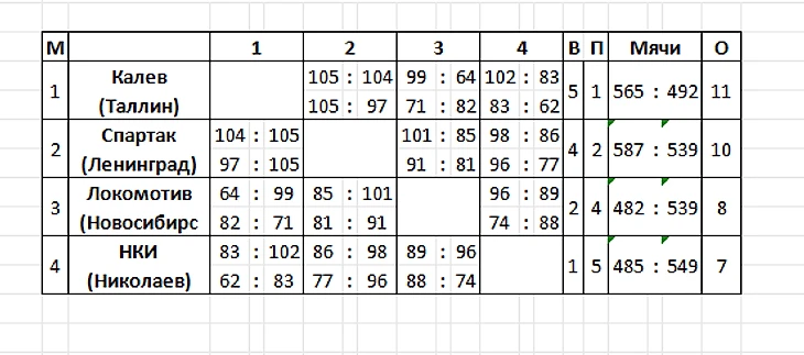 В Ленинграде, а затем в Таллине встречались «Калев» — 4–2 (2–1/2–1), «Строитель» — 4–2 (1–2/3–0), «Спартак» — 2–4 (1–2/1–2), СКА К — 2–4 (2–1/0–3). Ленинградцы дома проиграли «Калеву» и СКА, в Таллине — «Калеву» и «Строителю».
