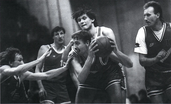 18 января 1988. Москва. УСЗ ЦСКА. Последний матч первого этапа LV чемпионата страны ЦСКА — «Жальгирис» — 86:76 (слева направо): Владимир Горин, Валерий Гоборов, Миндаугас Лекараускас (с мячом), Андрей Лопатов и Римас Куртинайтис (он набрал 22 очка)