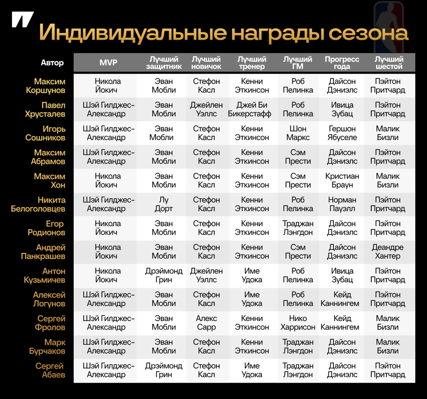 Родионов: Я с огромным уважением отношусь к тому, что делает Шэй Гилджес-Александер – он вырос не просто в звезду, а в лидера команды, которая из будущего пришла в настоящее. Его статистика – топовая, его влияние на игру – неоспоримое. Но мой выбор – Никола Йокич. И не потому, что он привычный ответ. А потому, что иногда очевидное – и есть истина.