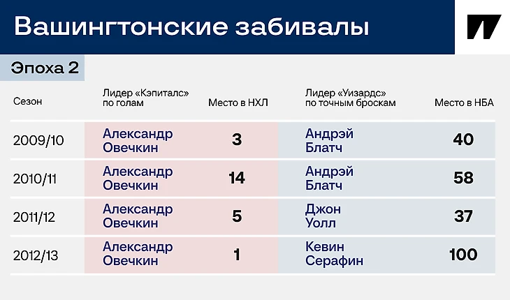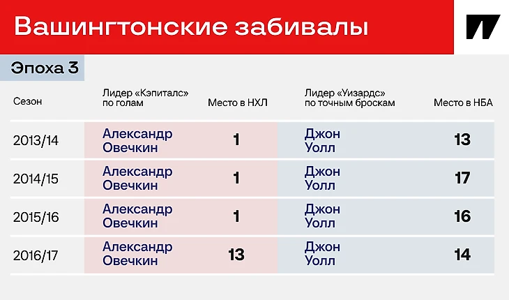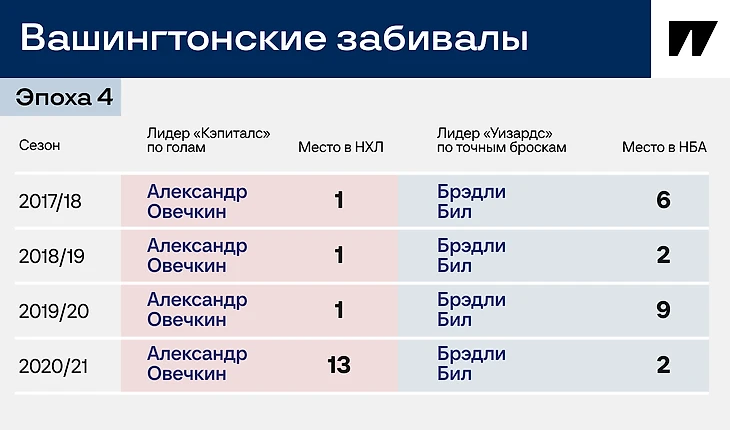 Во что верится сильнее? В то, что у почти 40-летнего Овечкина впереди еще один такой 4-летний период лидерства по голам в «Кэпиталс»? Или что в «Уизардс» в эти сезоны проявятся новые Уоллы, Аренасы, Билы или хотя бы Джеймисоны?