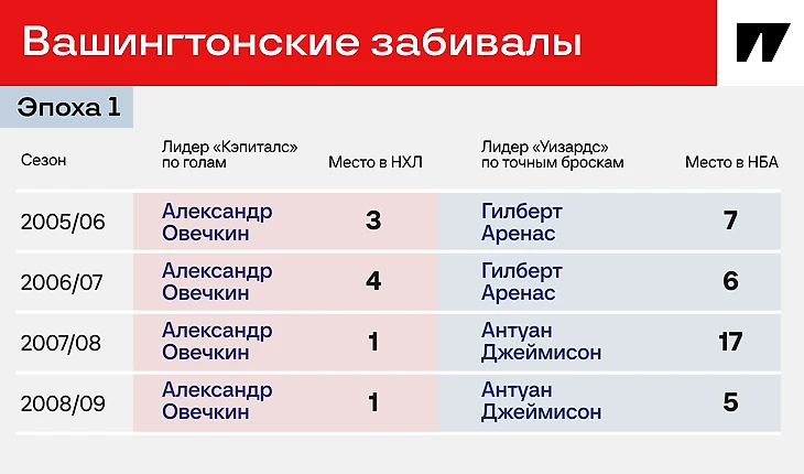 Но это в плей-офф, а в регулярных сезонах было иначе. Овечкин сразу влетел в снайперскую элиту НБА и даже дважды выиграл голевую гонку. Аренас и Джеймисон попадали много и метко, но не настолько, чтобы соперничать с лучшими.