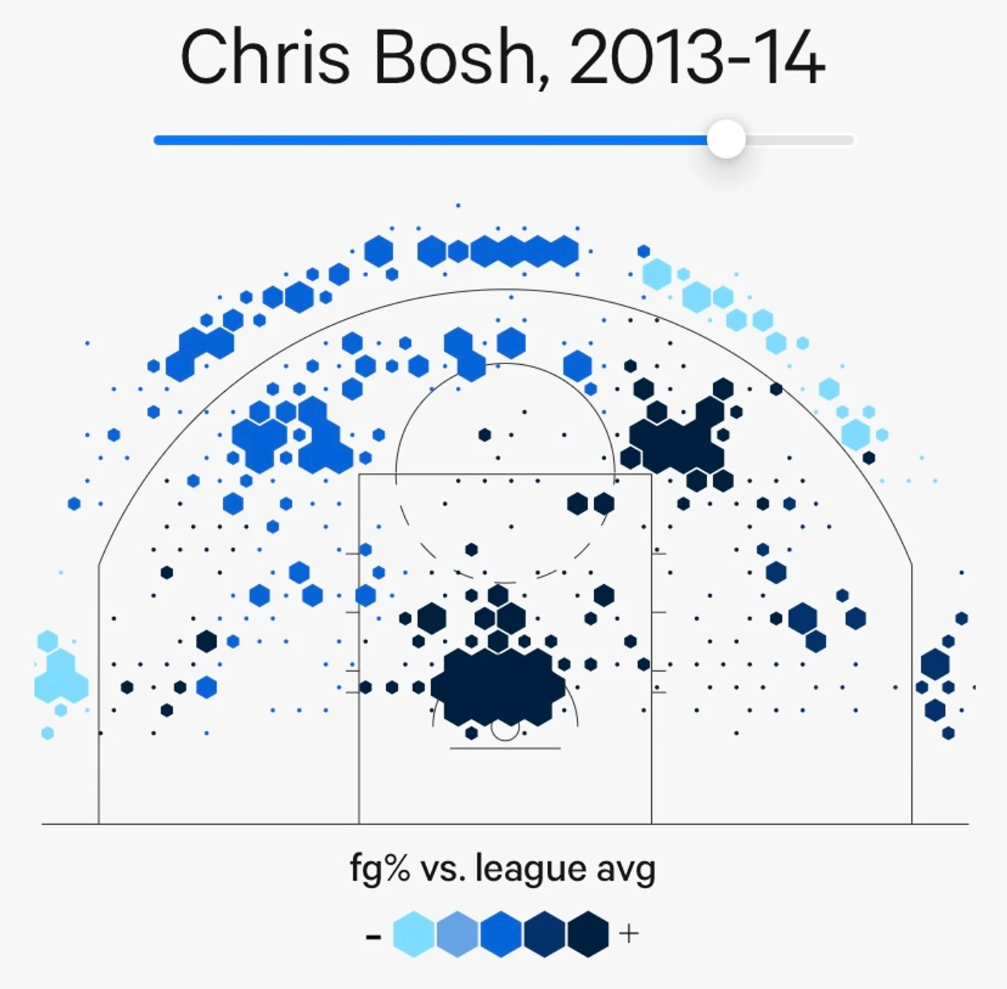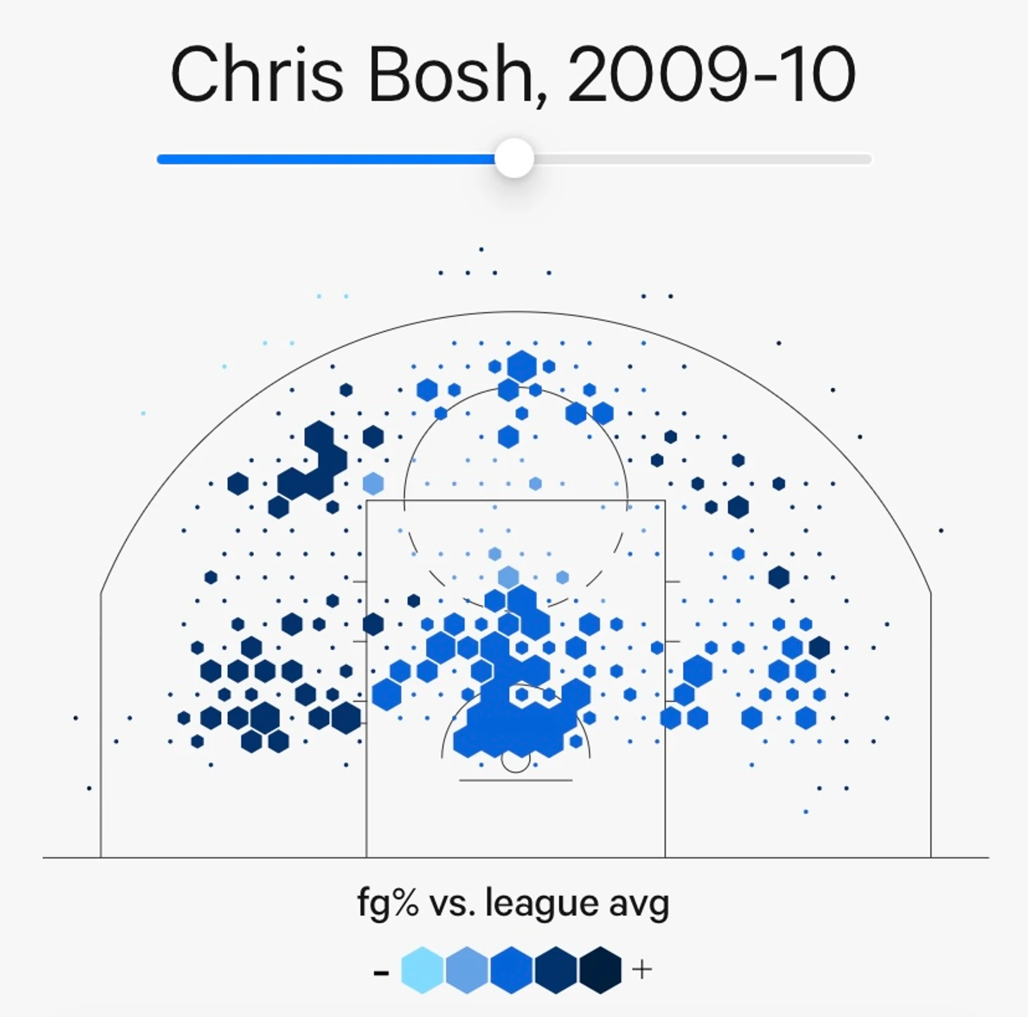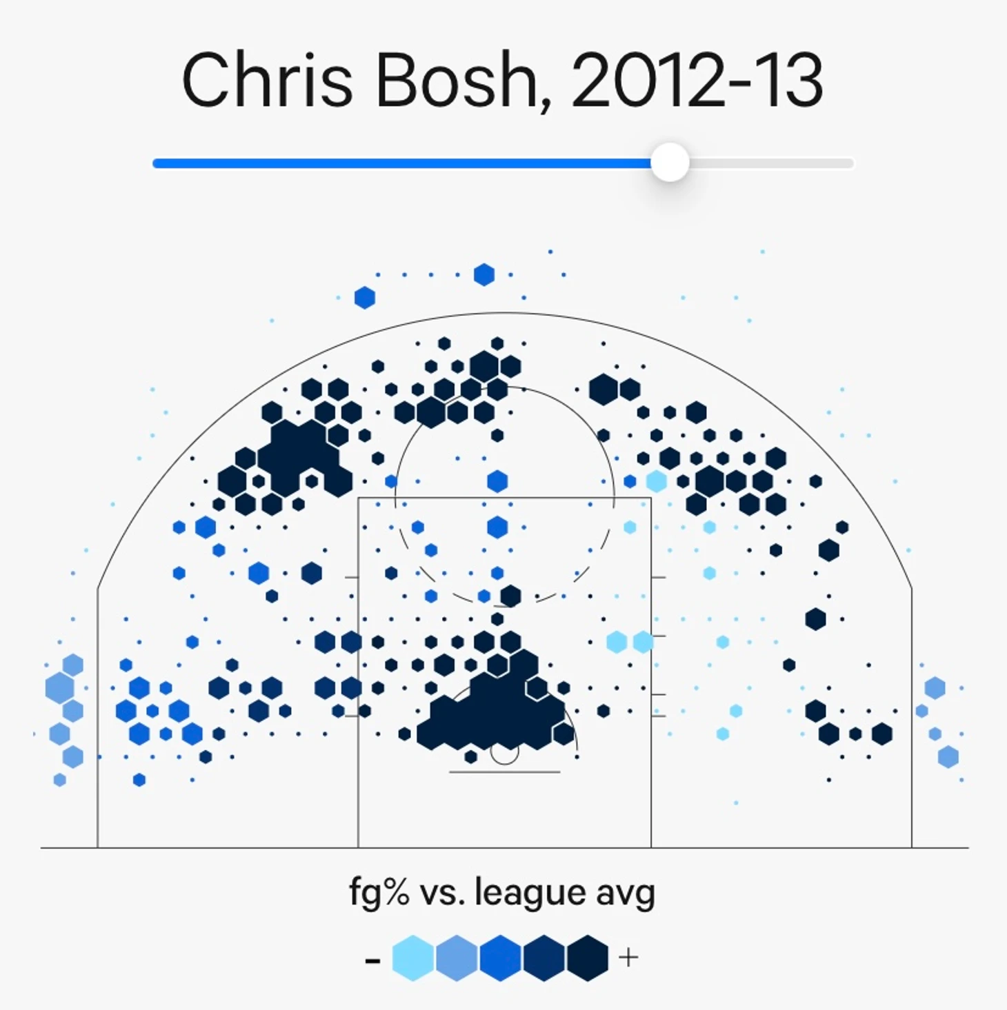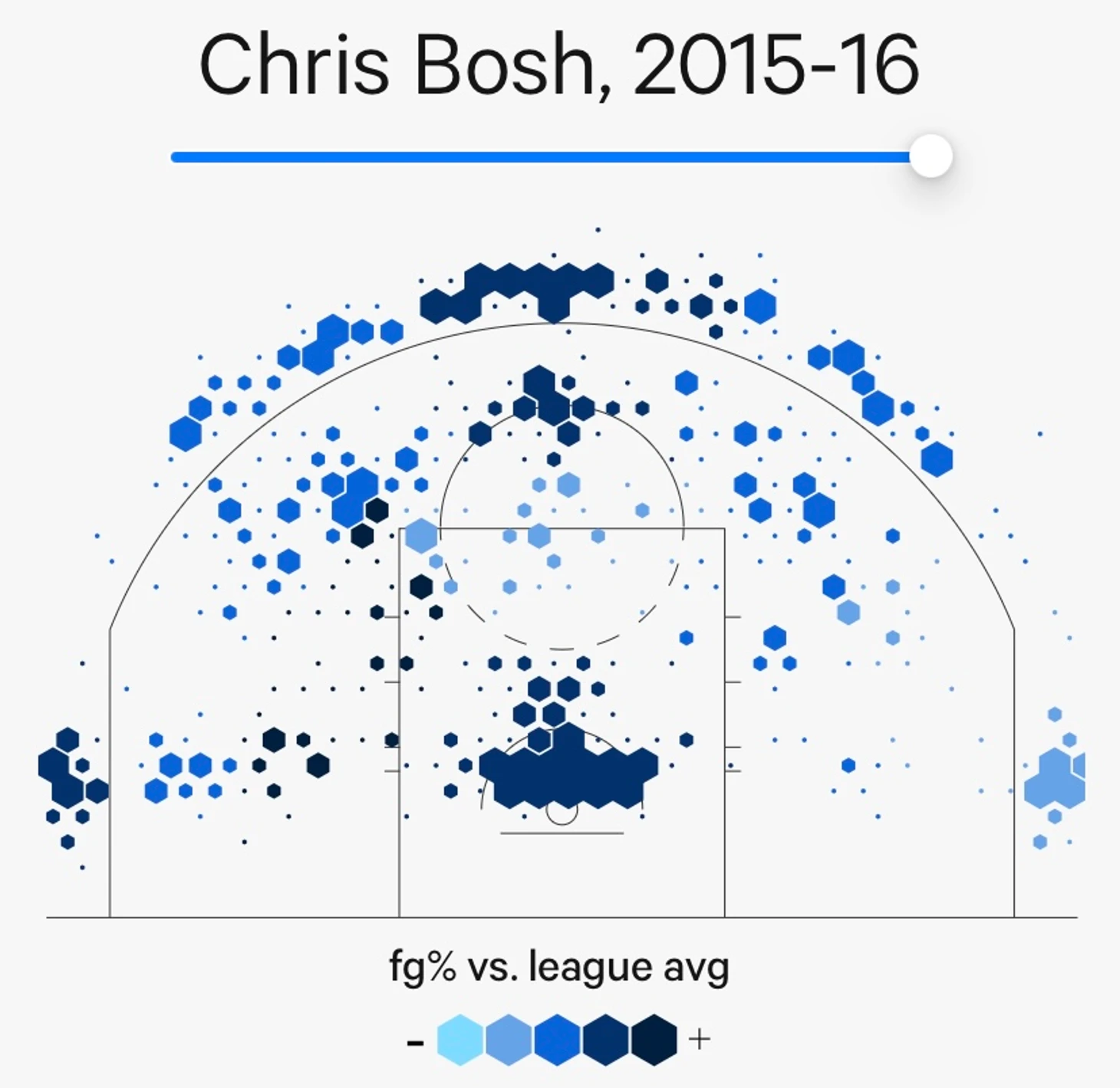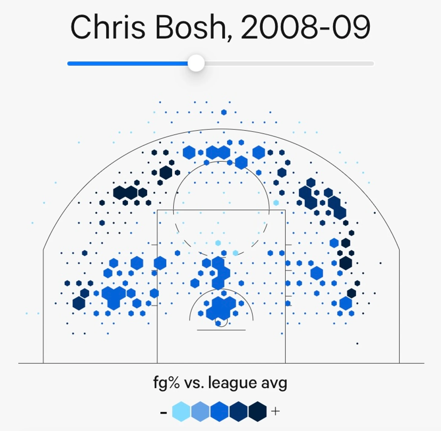 На этом чарте – чем темнее цвет, тем эффективнее бросал Бош с указанных точек, чем в среднем по лиге. Рассмотрим несколько сезонов.