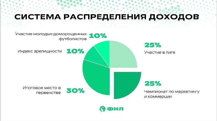 Для стимулирования клубов к активной работе была разработана продуманная система распределения призового фонда. 25% приходятся на участие в чемпионате, 30% – на положение в турнирной таблице, 25% – на результаты маркетингового чемпионата, 10% – на индекс зрелищности и еще 10% – на участие молодых игроков.