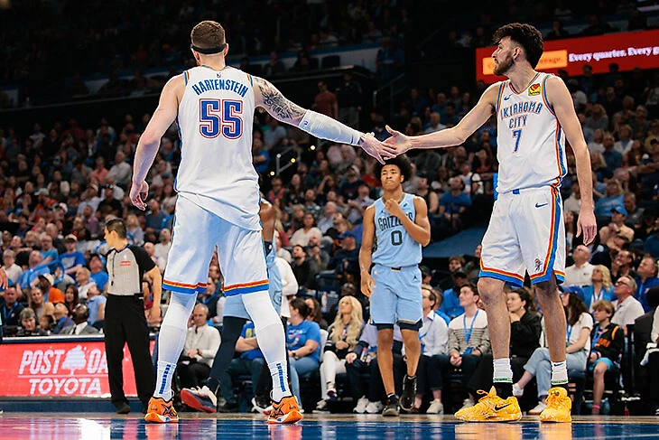 Оборона «Тандер» – это не только наличие суперцепких игроков периметра, но и возможность использовать сдвоенный центр из Айзейи Хартенштайна и Чета Холмгрена. Нечто подобное невозможно себе представить в исполнении «Лейкерс», «Наггетс» и уж тем более «Уорриорз», где единственный семифутер в составе Куинтен Пост больше специализируется на атаках с периметра.