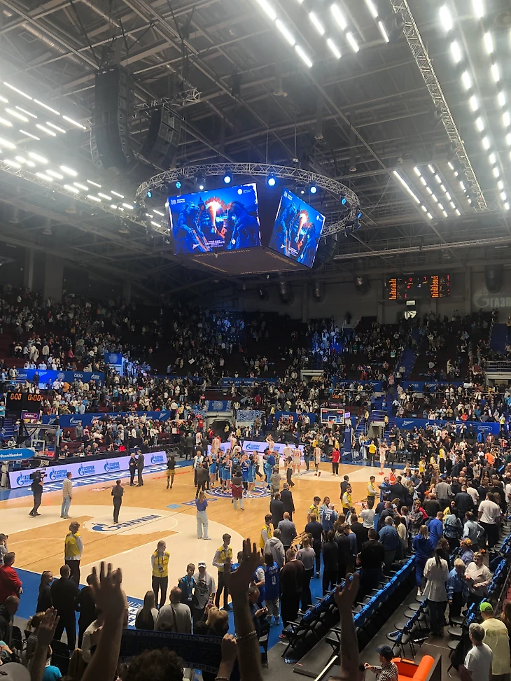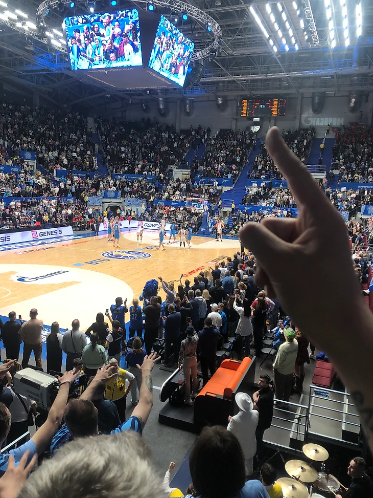 Заряды идут короткими включениями с фанатского сектора, вся арена в теме. Однозначно лучший мой баскет-матч по атмосфере!