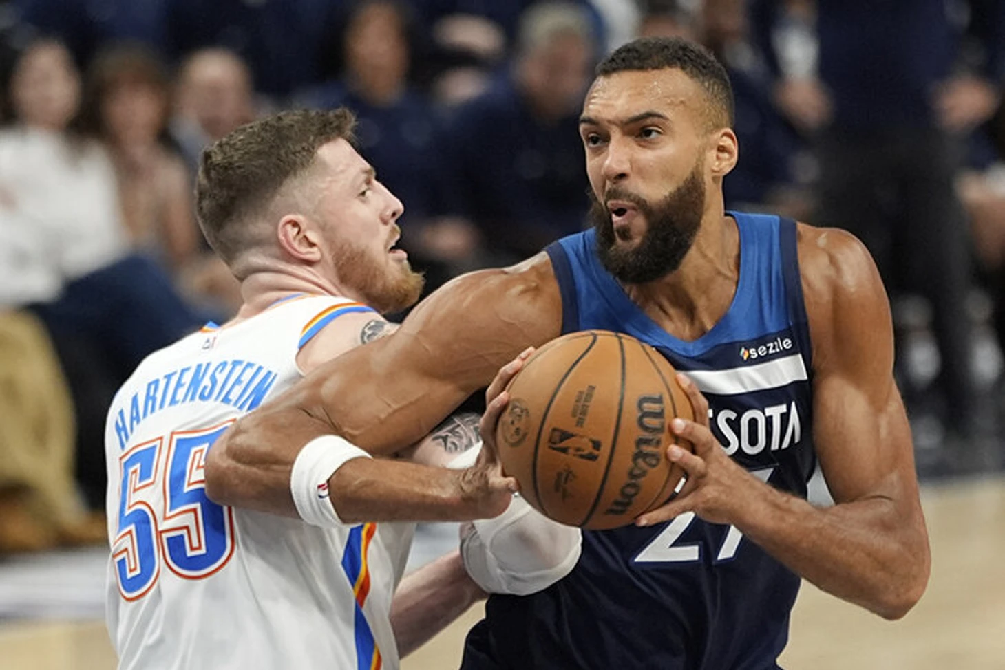 Игроки «Оклахомы», наверное, сами были шокированы таким «подарком». Ничего себе, Гобер водится на периметре. Сначала Холмгрен начал засовывать длинные ручища, чтобы выбить мяч, а потом и Дорт подкрался.