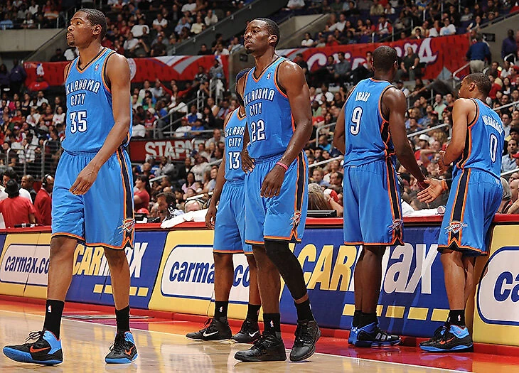 Как уже сказано, мы начинаем историю этой трансформации не совсем с финала-2012, а чуть раньше. В плейофф-2010 «Оклахома» могла выпустить на паркет полноценную пятерку из игроков, собранных в последние три года на драфте. Многих из них собирал еще «Сиэтл» – даже в 2008-м официальный переезд случился уже после даты драфта, новички еще позировали в зелено-желтых кепках «Соникс».