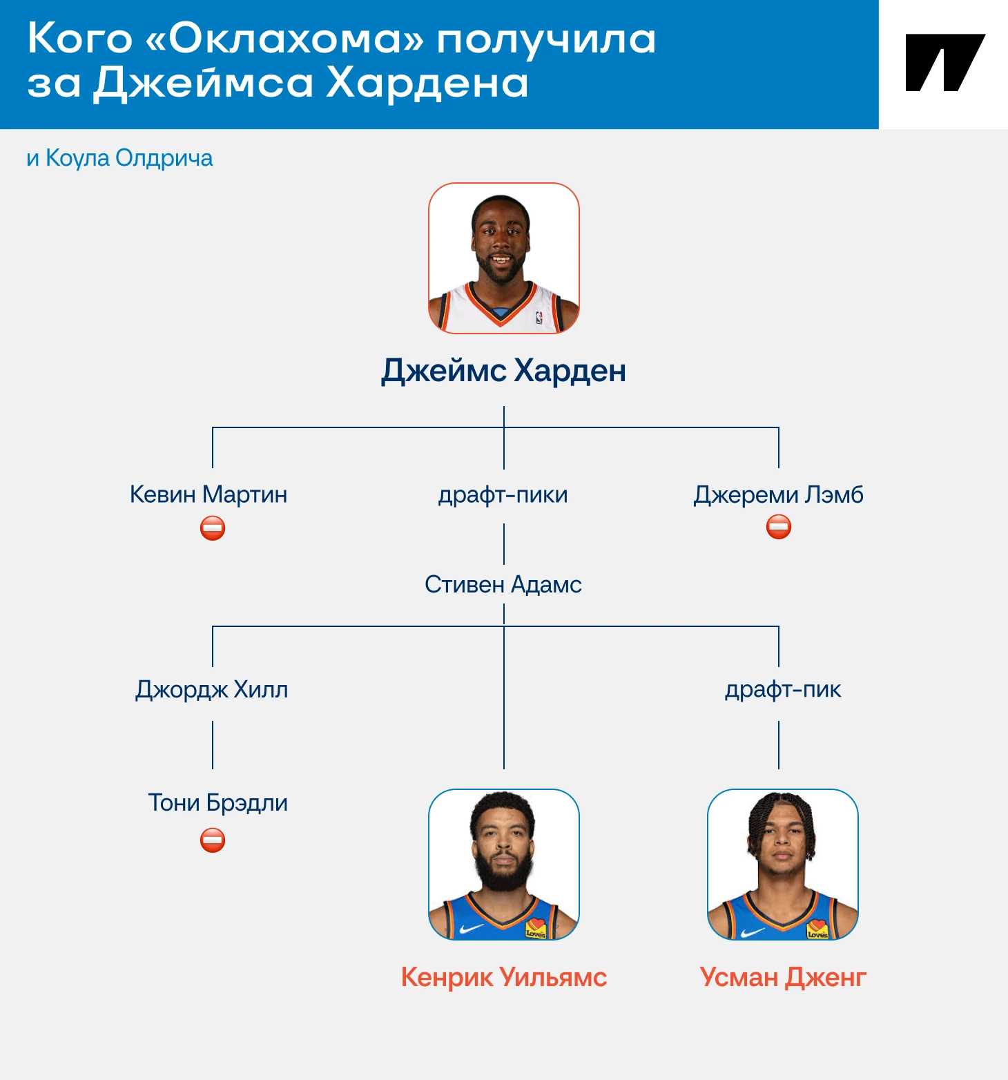 Конечно, у одного Хардена карьера была в разы лучше, чем у всех игроков и активов, растущих в древе его обмена из «Оклахомы». И все же Мартин, Адамс, молодые баскетболисты и будущие пики помогали «Тандер», пускай, и не строить контендер, но хотя бы очертить контуры стратегии.