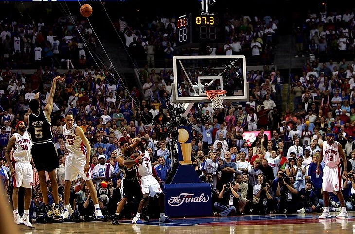 Самый знаковый матч, конечно, шестой. «Сперс» уже были в шаге от титула, площадку оградили, готовились выносить чемпионский титул. За 22 секунды до конца основного времени «Хит» отставали на 3 очка.